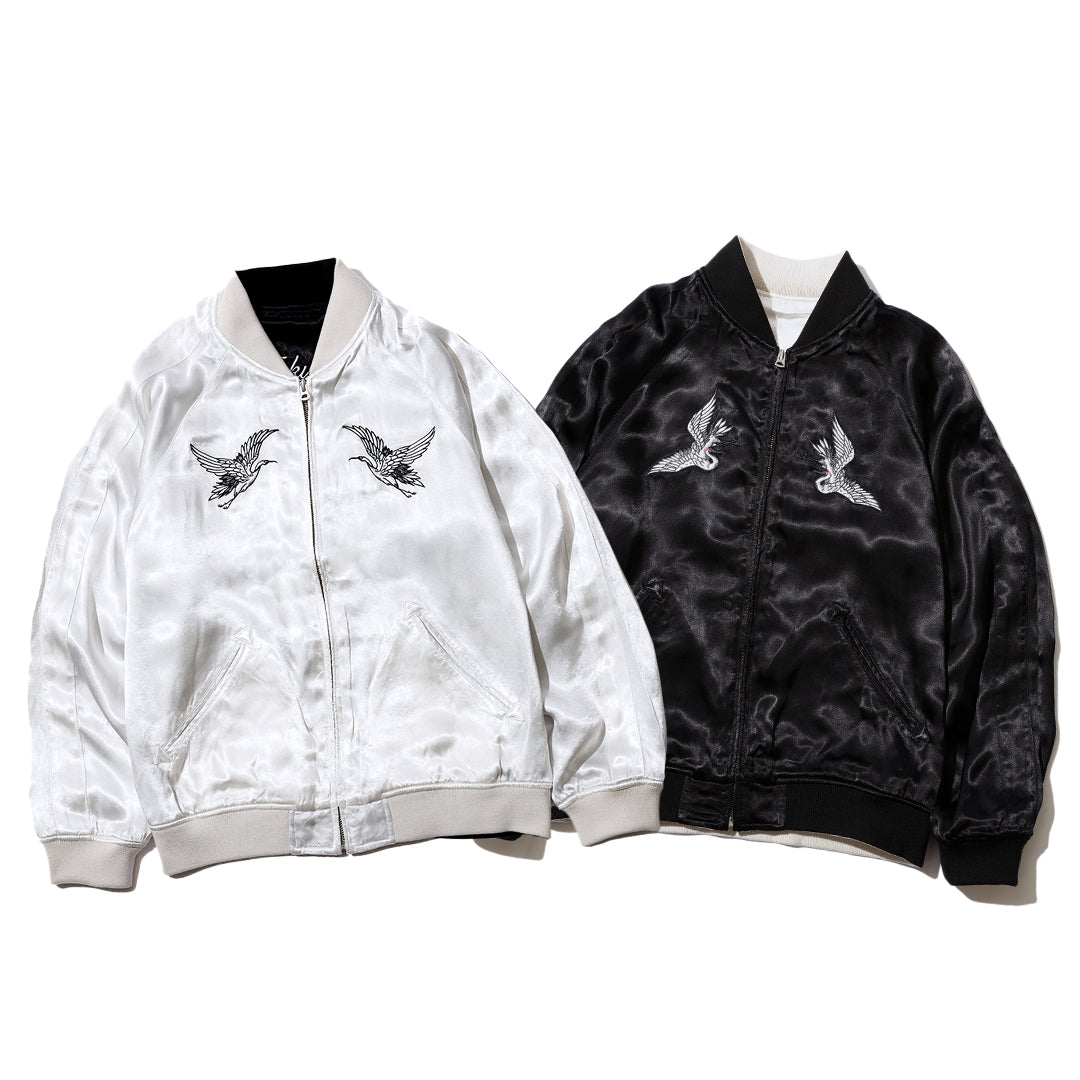 吉祥のモチーフ” 鶴”を大胆に使用した リバーシブルスカジャンはブラックとホワイトの両A面仕様。